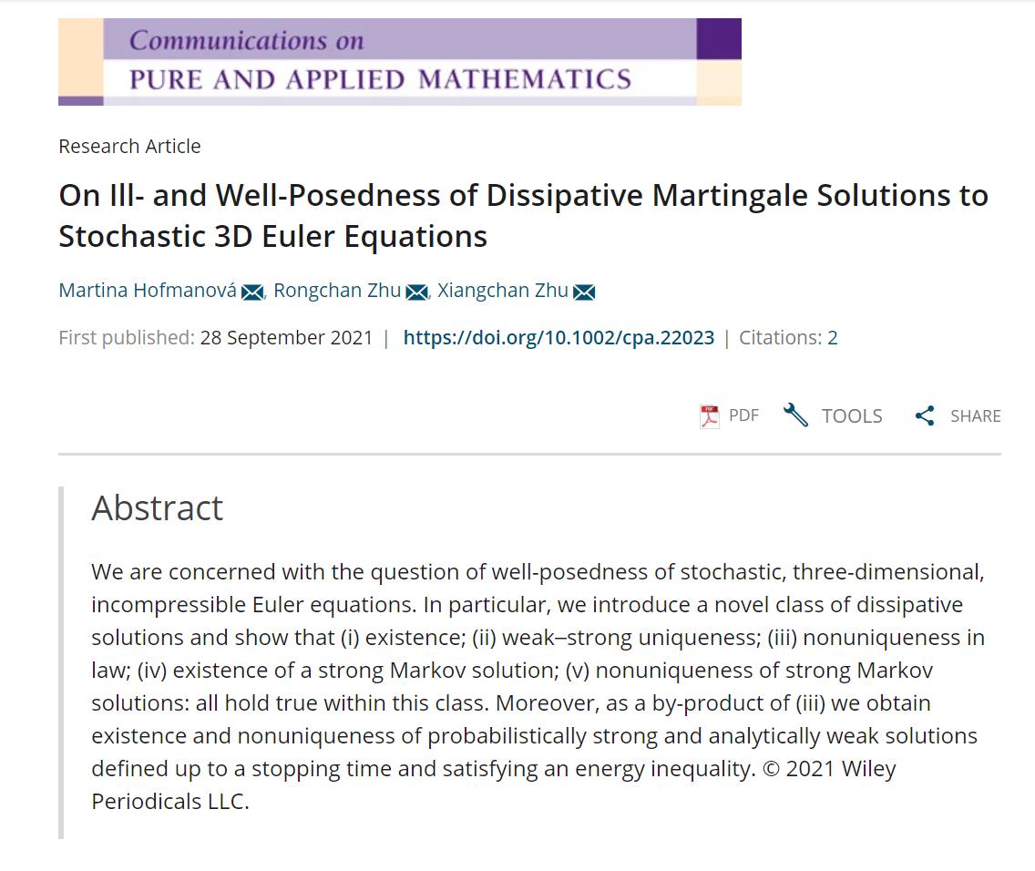 日前,必威西汉姆联朱蓉禅教授在国际顶级学术期刊《Communications on Pure and Applied Mathematics》上发表了题为《On Ill- and Well-Posedness of Dissipative Martingale Solutions to Stochastic 3D Euler Equations》的研究论文。该研究首次对于随机三维欧拉方程提出了耗散鞅解的概念并证明了耗散鞅解的存在性、弱强唯一性、分布不唯一、马氏解的存在性和不唯一性。更进一步,朱蓉禅教授和合作者证明了随机三维Navier-Stokes方程的马氏解不唯一,并对随机三维Navier-Stokes方程首次构造了概率意义的强解,解决了随机偏微分方程领域一个困扰多年的问题。相关结果近期被概率论顶级期刊《The Annals of probability》接收。