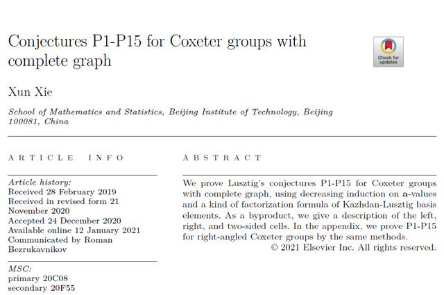日前,北理工必威西汉姆联谢迅副研究员在国际权威学术期刊《Advances in Mathematics》上发表题为“Conjectures P1-P15 for Coxeter groups with complete graph”的研究论文。该论文证明了Lusztig猜想P1-P15对完备图Coxeter群成立。