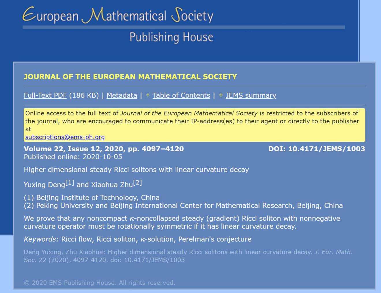 日前,必威西汉姆联邓宇星教授在国际顶级学术期刊《Journal of the European Mathematical Society》发表题为“Higher dimensional steady Ricci solitons with linear curvature decay”的研究论文。该论文证明了当维数不小于4时,数量曲率线性衰减并且具有非负曲率算子的体积非塌缩稳态型里奇孤立子必然旋转对称。也就是说,这类孤立子或者同构于欧式空间,或者同构于Bryant孤立子。当维数为4时,曲率算子非负条件可以减弱成截面曲率非负。