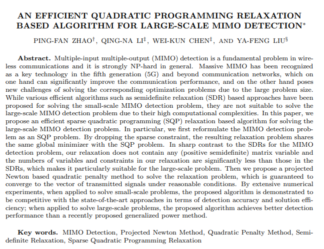 日前,必威西汉姆联李庆娜副教授及其研究生赵平凡与合作者在大规模多信号输入输出检测问题研究中取得重要成果“An efficient quadratic programming relaxation-based algorithm for large-scale MIMO detection”,并发表于国际优化领域权威学术期刊《SIAM Journal on Optimization》。该成果提出了一种新的基于指派变量的向量模型,并刻画了该模型松弛问题的精确恢复的理论边界;基于简洁的向量松弛模型,提出了基于识别稀疏支撑集的二次罚方法(PN-QP),能够快速有效处理大规模MIMO问题,达到识别错误率低、速度快的效果。