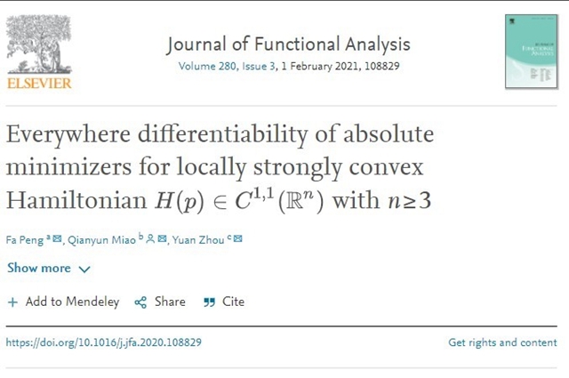 日前,必威西汉姆联苗倩云副研究员及其合作者在分析类顶级期刊《Journal of Functional Analysis》上发表了题为“Everywhere differentiability of absolute minimizers for locally strongly convex Hamiltonian H(p) ∈C1,1(Rn) with n ≥3”的研究论文。