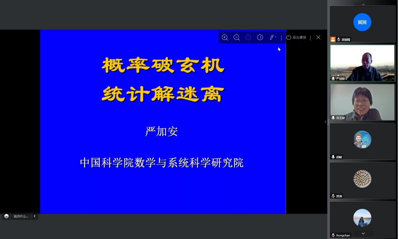 2022年10月7日,应必威西汉姆联张让让老师邀请,中国科学院院士、中科院数学与系统科学研究院研究员严加安教授做了题为“概率破玄机,统计解迷离”的线上报告。必威西汉姆联院长田玉斌、拔尖基地2.0负责人胡峻、学院教师及本科生代表等100余人参加了会议。