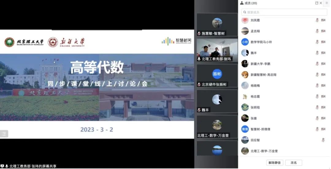 3月2日下午,BETWAY必威与新疆大学开展了《高等代数》线上教学研讨会,BETWAY必威教务部副部长张玮、必威西汉姆联副院长徐厚宝,新疆大学教务处副处长李鹏、数学与系统科学学院副院长杨志霞出席会议,两校授课教师团队、教学管理团队和智慧树网相关负责人参加研讨。