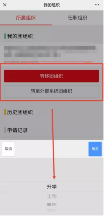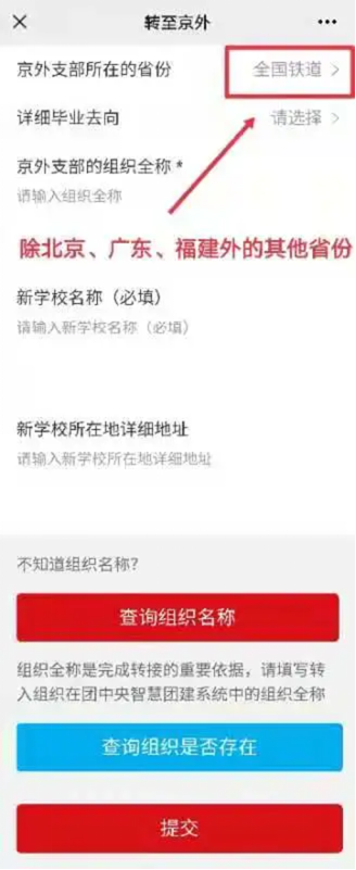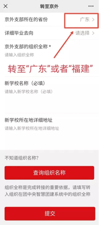 2、如转入京内团组织,则选择“转移团组织”;如转入京外团组织,则选择“转至外部系统”。点击后,在毕业去向栏内如实进行标注。京内团组织可根据组织ID或全称进行查询;转至外部系统需根据系统提示准确填写团组织名称及其他信息。