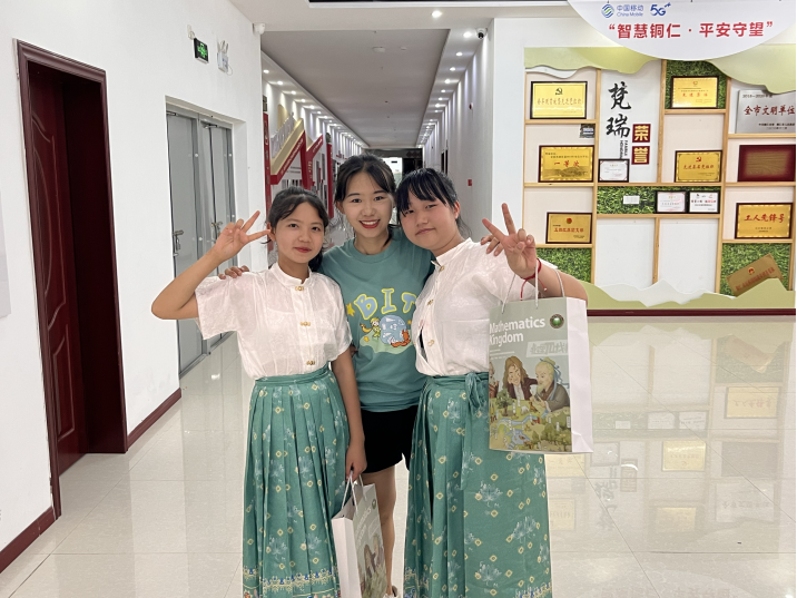 数学是方法、是途径,是所有学科的基础。2021年7月,为引导和帮助广大青年学生在与现实相结合的“大思政课”中“受教育、长才干、作贡献”,引领学生立志做有理想、敢担当、能吃苦、肯奋斗的新时代好青年,必威西汉姆联开展“乡村π计划”,组建学生分别前往贵州、山西、内蒙古等三十多所中小学校开展数学文化传播。詹思萌随团前往贵州省铜仁市江口县梵瑞社区,躬身实践,助困帮扶,以心灵搭建城乡教育桥梁,用关怀助力乡村学子成长,诠释当代青年对基础学科人才培养的责任和担当,为乡村教育贡献力量。